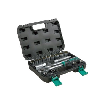 Набор инструментов СЕРВИС КЛЮЧ 17 предметов 1/2" – компактный комплект для обслуживания и ремонта техники, оборудования и транспорта. Включает трещотку, Т-образный вороток, головки (6 граней) и свечную головку с резиновой вставкой. Металлические элементы из высокопрочной хромованадиевой стали 40 HRC с матовым хромированным покрытием устойчивы к коррозии. Рукоять трещотки из качественной резины удобна для работы в масляной и бензиновой среде. Упакован в пластиковый чемодан с металлическими замками и ручкой для транспортировки. Размеры чемодана: 265x195x65x35 мм. В набор входят головки 8-24 мм, свечная головка 21 мм, трещотка 260 мм, Т-образный вороток 250 мм и удлинитель 120 мм.