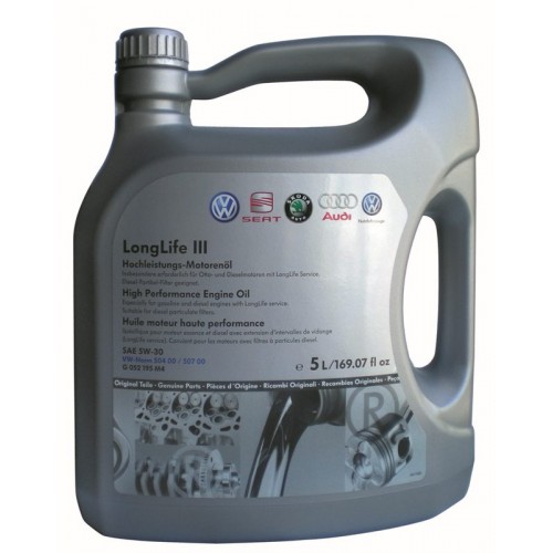 W Longlife III SAE 5w-30 - Высококачественное моторное масло с высокими эксплуатационными характеристиками, разработано специально для применения в современных бензиновых и дизельных двигателях автомобилей VW, Audi, Skoda, SEAT, в том числе оборудованных фильтрами твердых частиц (DPF), в которые производителем автомобиля указано заливать масло с вязкостью по SAE 5w-30 соответствующее спецификации VW-norm 504 00/507 00. Может применяться в удлиненном интервале замены моторного масла. Защитит от износа и предотвратит коррозию. Способствует снижению потребления топлива.