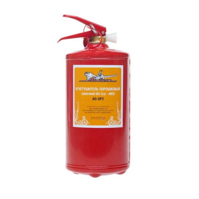 Огнетушитель порошковый ОП2 яввляется переносным и закачным. Используется для тушения возгарания любых горючих жидкостей и газов. Тип используемого порошка BCE. Вес порошка 2 кг. Для отслеживания уровня давления в баллоне огнетушителя на головке устройства установлен манометр. После применения огнетушитель можно перезарядить. Срок службы - 10 лет, перезаряжать необходимо каждые 5 лет.