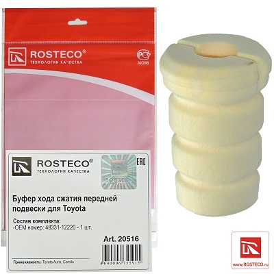 Буфер хода сжатия ROSTECO изготовлен из Пено-полиуретана, что обеспечивает высокую степень устойчивости автомобиля на крутых поворотах, и защищает надёжно подвеску от пробоев. Изделие устойчиво к абразивному износу, также обладает устойчивостью и воздействию органических растворителей, озону, ультрафиолетовым лучам. Рабочая температура изделия -60oС +100oС.