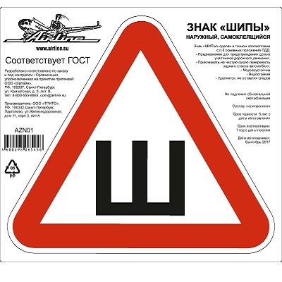 Постановлением правительства (№ 333 от 24 марта 2017 года) отсутствие знака «Шипы» внесено в число неисправностей, при которых запрещена эксплуатация транспортного средства. Таким образом, начиная с 4 апреля 2017г. любой автоинспектор, не обнаруживший этого знака на автомобиле с шипованной резиной, может выписать штраф в размере 500 рублей, либо запретить двигаться дальше — пока соответствующая неисправность не будет устранена. Мы предлагаем Знак «Шипы» самоклеящийся для наружного нанесения на стекло (легко снимается, не оставляя следов). Знак полностью соответствует ПДД и ГОСТ: стороны треугольника 200мм, ширина каймы 20 мм.