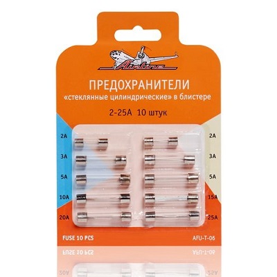 AIRLINE представляет набор предохранителей для электрической цепи аккумулятора автомобиля. Данная модель предохранителей имеет форму цилиндра и стеклянную оболочку. Данные предохранители широко распространены и используются не только в автомобилях, но и других многочисленных технических устройствах. Плавкая вставка изделия произведена из цинка, что является несомненным преимуществом предохранителей.